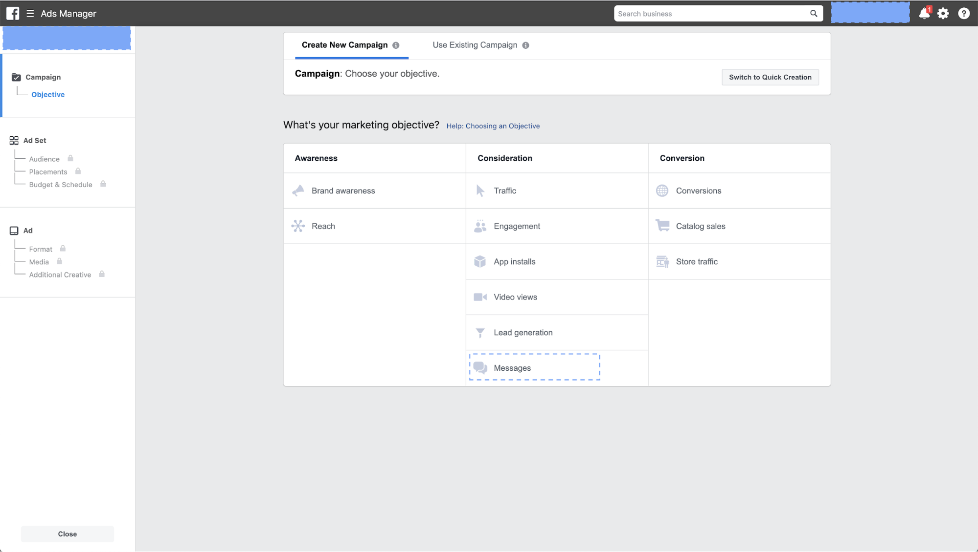 2. Choose **Messages** as your marketing objective. Keep in mind that the **Messages objective** is unavailable when targeting India and selected EU countries.