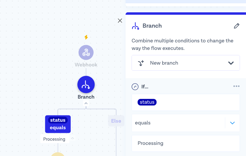 To make sure that we only send notifications when the order status is **processing**, we can add a check inside the flow. To do this, follow these steps:
