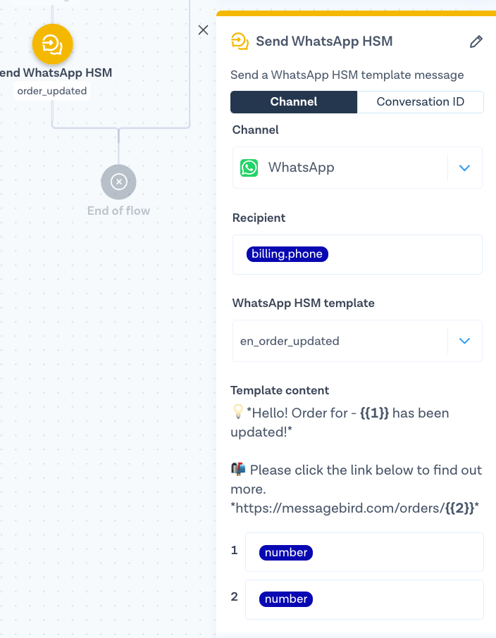 To do this, we'll need to use an existing [WhatsApp message template](https://docs.bird.com/connectivity-platform/getting-started/working-with-whatsapp-message-templates). We'll use the **billing.phone** parameter from the billing details and the order number to refer back to the order. Depending on the message that you would like to send to your customer, you could make use of other variables such as **shipping.state**, **id** (the order ID), or total. Inspect the Logs for a full list of available variables.