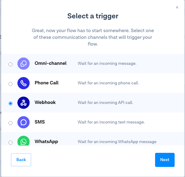 2. Click **Create new flow**, then **Create custom flow**, then select **Webhook** from the list of triggers\ <br>
