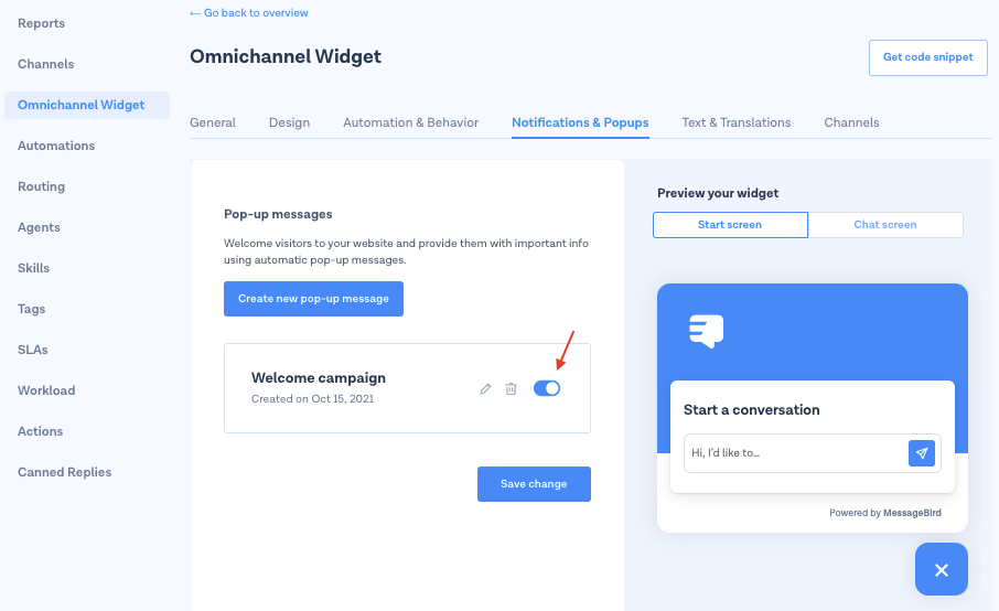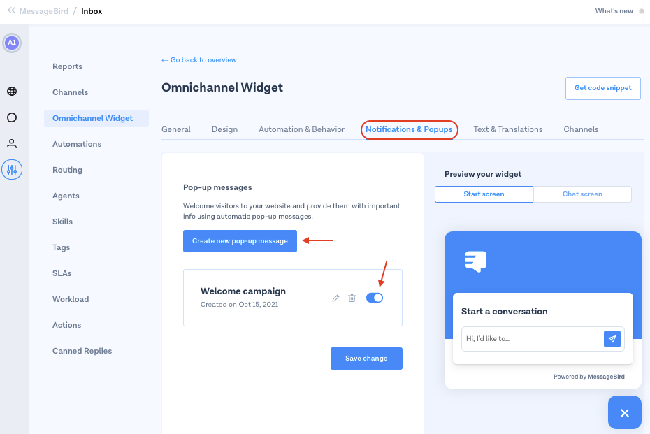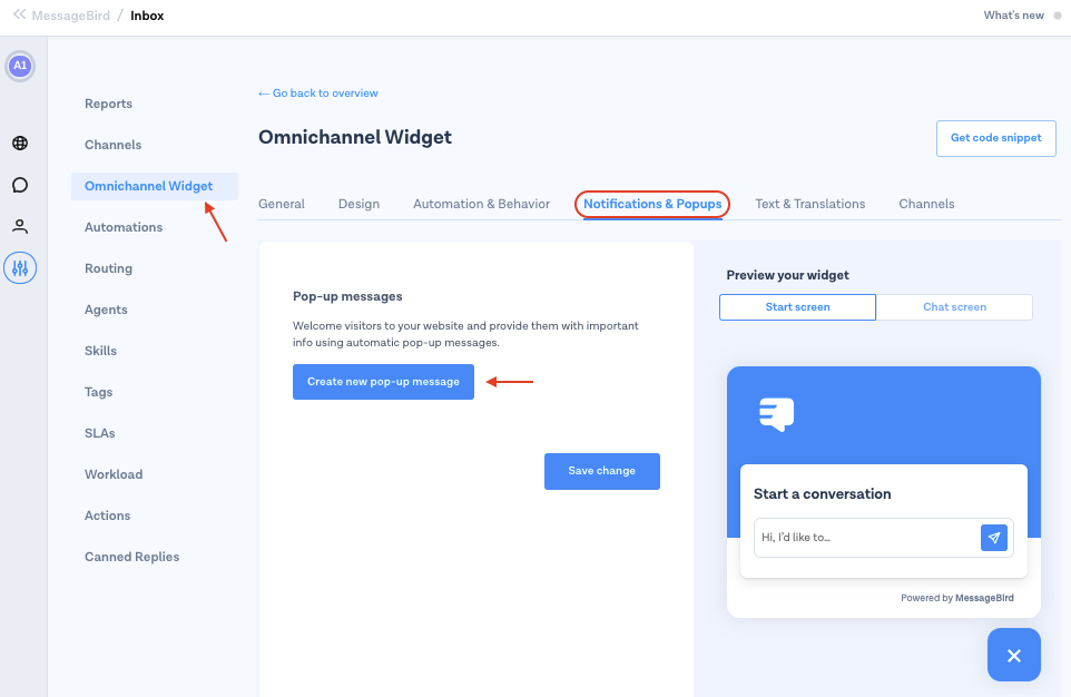 To get started with Live Chat pop-up messages, head over to the 'Notifications & Popups' tab in your [Omnichannel Widget settings](https://inbox.messagebird.com/manager/omnichannel-widget). From here, click 'Create new pop-up message' to go to the pop-up message configuration page: