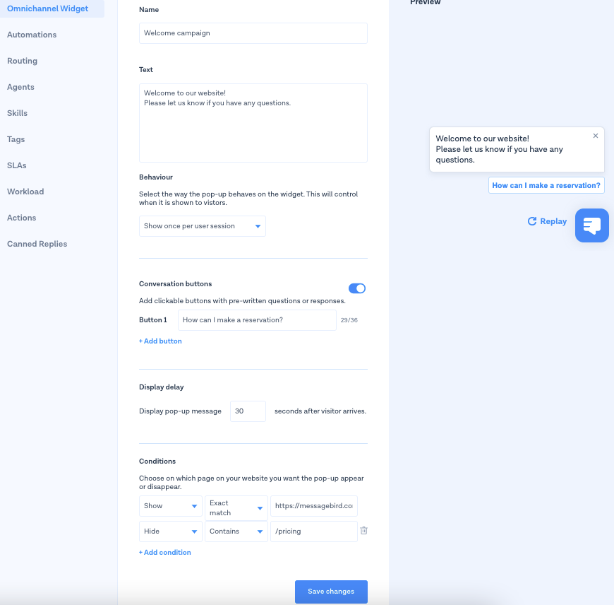Ready? Click “Save changes” to save your pop-up message and then enable it in the dashboard. That's it, you've created a Live chat pop-up message! 🎉