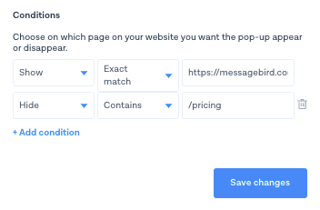 1. Add a 'Show' condition. Select 'Exact match' from the drop-down menu, then add the complete URL of your homepage into the text field. This will ensure that your pop-up message is shown on the correct page.