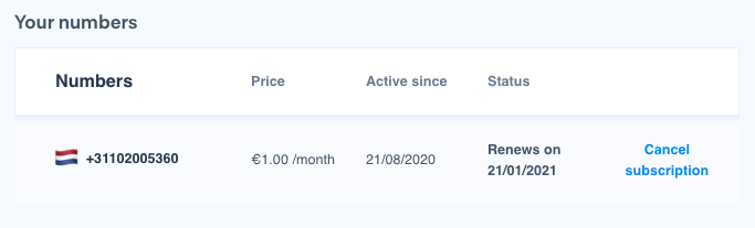 You can view all your active numbers on your Subscriptions page by clicking on your workspace name in the top right corner > Billing > Subscriptions. Subscriptions are renewed automatically, meaning that this will stay active as long as there is enough balance in the account. If you do not have enough balance in the account to renew your subscription, we will send you two top-up reminders: 1 month and 2 weeks before the renewal of the subscription. If you have insufficient balance on the account to renew the subscription on the renewal date, the Number will be disconnected and you will be notified by email.