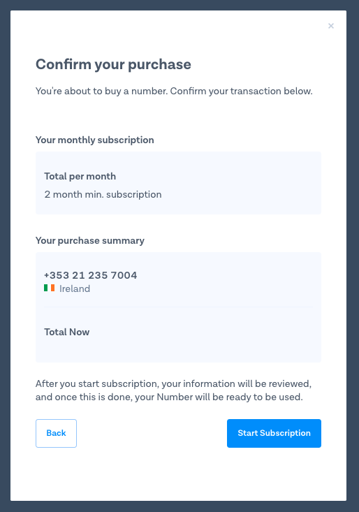 When you are finished with your number selection, press 'Continue'. A confirmation pop-up window will appear with some details on the subscription in your order. Press 'Start Subscription' to add the Number to your account. If you were asked to provide further details or documents, our team will review this and you will receive an email when this is done.&#x20;