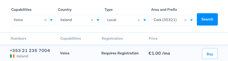 On the next page, you can select the type of number you want from dropdown menu's. You will need to select a capability (Voice, SMS or both) and a country. Depending your request, you may also need to fill in a type of number (local, mobile) and an area/prefix. Based on your selection, available numbers will appear with their monthly cost. For some numbers you will see an extra column called 'Registration'. If registration is required, we will ask you for further info and documents to do so in a few steps.&#x20;