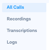 You can choose between several tabs which makes it easy to see exactly the call details you are looking for. 'All Calls' is an overview of all calls including the date, caller and callee number, status, time and cost. 'Recordings' and 'Transcriptions' is where you can find all calls which you recorded or transcribed via [Flow Builder or API](https://support.messagebird.com/hc/en-us/articles/360000704049-Recordings-transcriptions). 'Logs' is a list of all call logs for detailed info on call data.