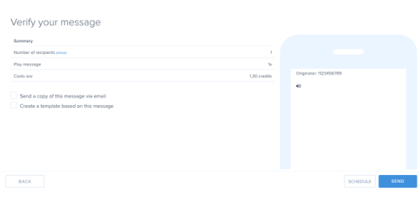 Repeating a voice message can be useful when sending login tokens, one-time-passwords, or when including a number that you’re requesting a call-back on. This can also lengthen the message enough to avoid a possible voicemail catching the message.