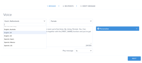 In the two drop-down menus, you can select a range of languages per country, with a male/female voice preference. In the bottom right corner, you see the number of characters that are still available within the message and you can also select how often you want the message to play.