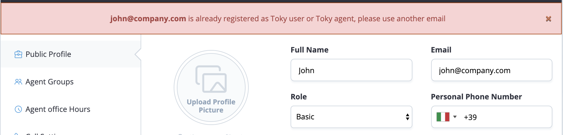 When you try to add an agent that is already registered in Toky from your account or in another Toky account, you will get an error message like this one: