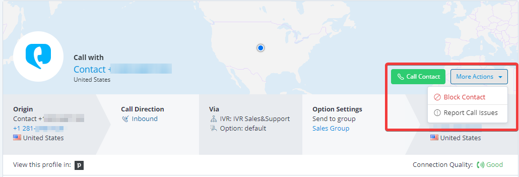 **5.** Click on the **Block Contact** button to block the contact. This option is not available for outbound calls or web calls.