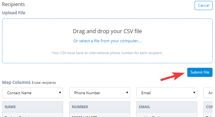 * If you want to remove contacts from the list, click on the **delete** button. If you want to add recipients, click on **Add Recipients** and upload the file, new records will be appended to the current list.