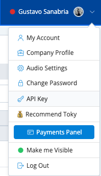 First, you will need the API key of the Toky account (available to admin accounts only). Go to your name in the upper-right corner and hit the API Key option: