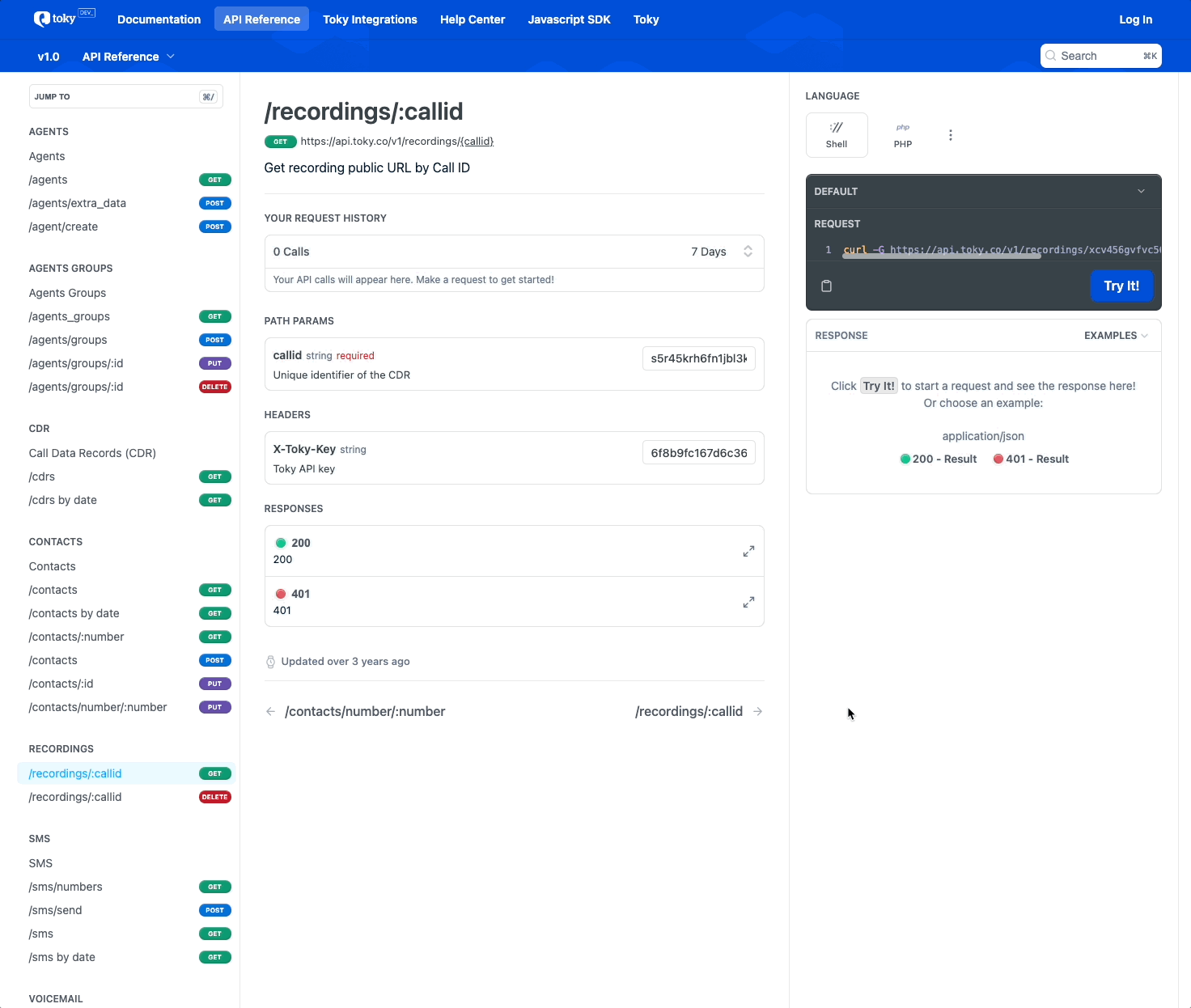 Once you have copied your API Key, go to our developer portal on the call recordings reference available [here](https://developer.toky.co/reference/recordings-url).