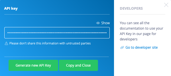 There, you can paste your API Key (exactly as it was copied from the web app, **no** extra characters added) on the field for that purpose: