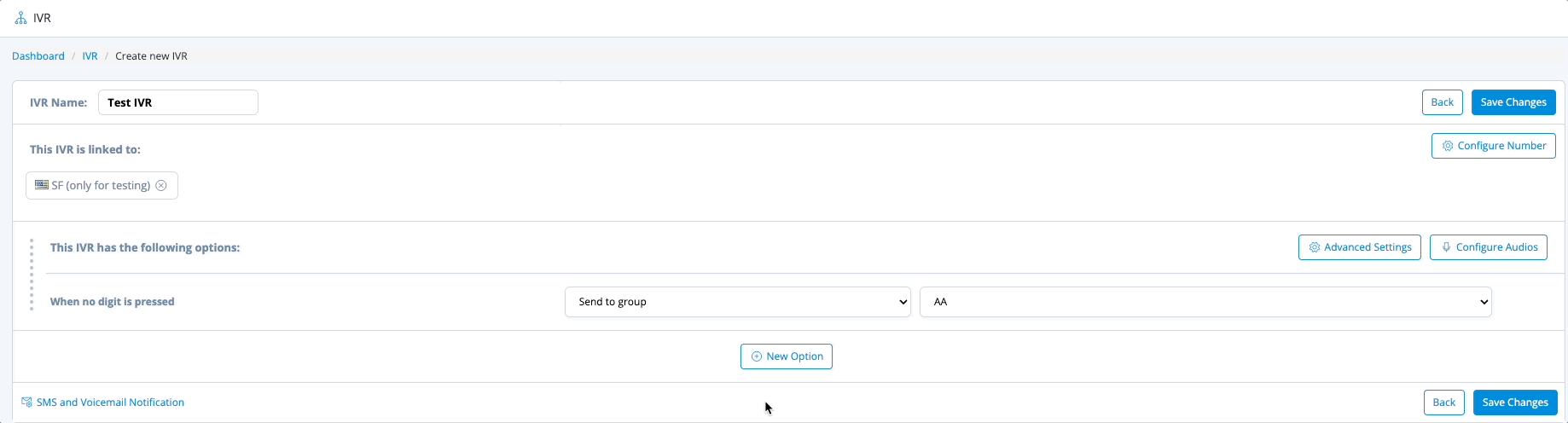3. The IVR settings will show up and you can see the Number assigned to it, this means that the IVR will handle every single inbound call to this number, simply select the default option to send the call to either an agent or group and hit Save Changes, You'll get a confirmation message: