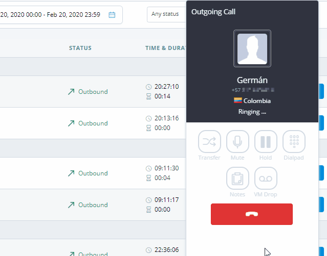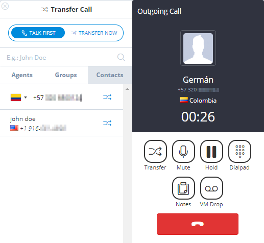 When an agent answers a call, the dialer enables new options, including the Transfer button.