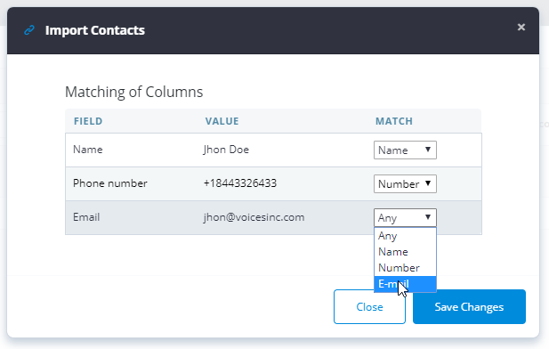 The first row of the file must be the fields name and the name and phone number fields are required.