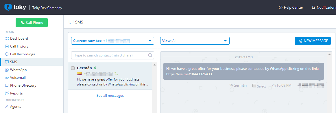 Learn how to send SMS messages with Toky in [this article](https://tokyapp.zendesk.com/hc/en-us/articles/360020674777) and If you need to send SMS messages to a customer list, you can use [Toky Bulk SMS Sender](https://tokyapp.zendesk.com/hc/en-us/articles/360020813298) and send your personalized messages from Google Sheets.