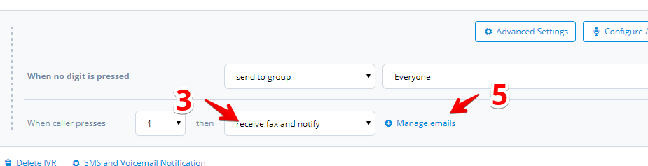 3. Add the option with the number for your customers to use to send a fax and select the action **Receive fax and notify**