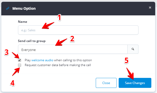 Menu Options are exactly that: options in a menu that you offer to your callers when they want to contact you. These options are a visual way of letting your customers guide themselves inside your telephone menu.