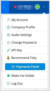 1. From your Toky dashboard in the upper right corner, please click on your Toky profile name, and then from the drop-down select *Payment Panel .*\