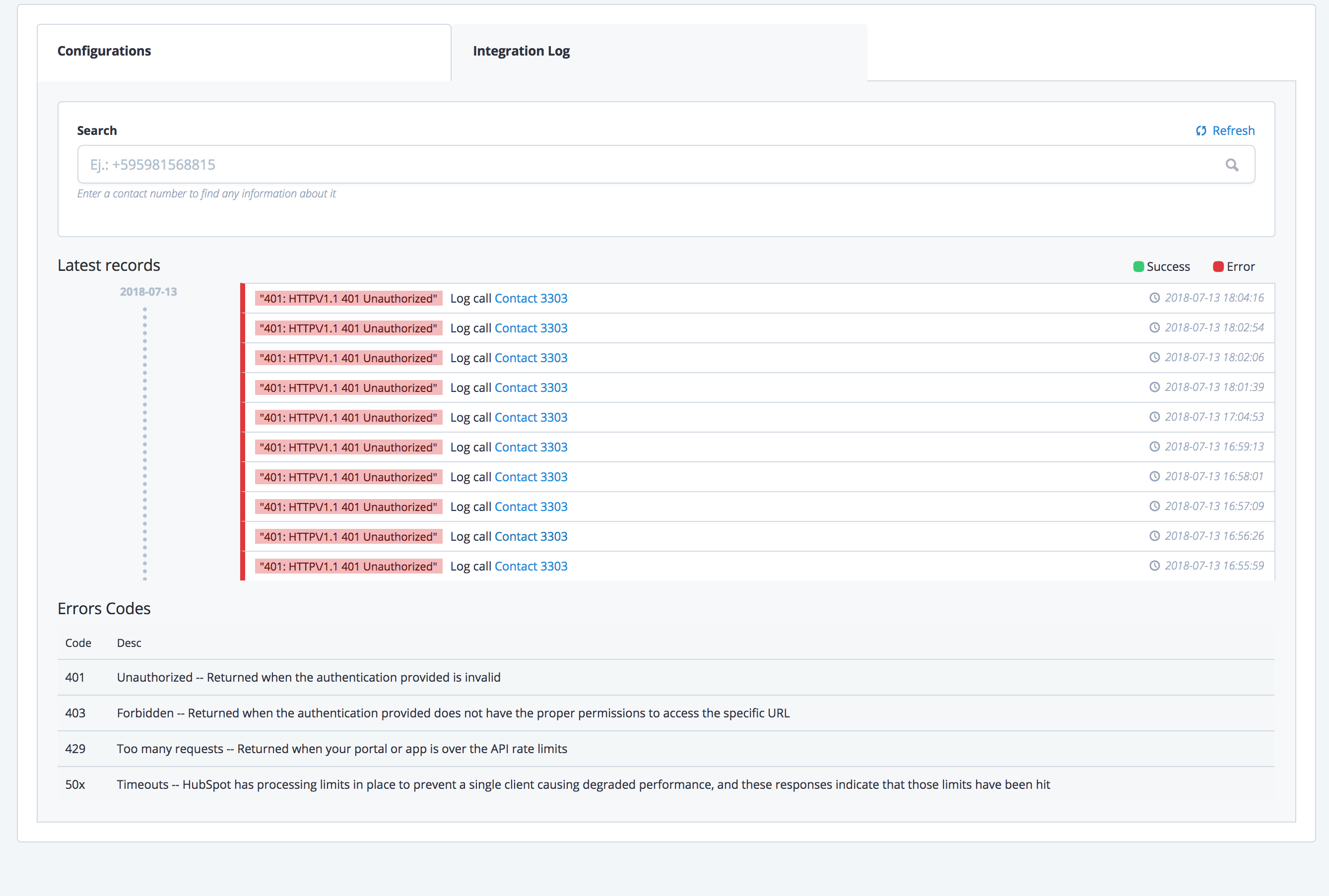 * **Check the log for problems:** Select the *Integration Logs* tab and verify messages. Check if you have authorization or any other technical problems with the CRM and verify every step of the integration. Click on *Save changes.*