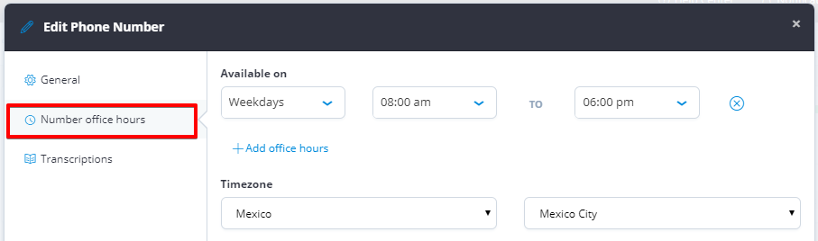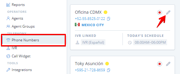 Each phone number can have a set availability for the time zone and conditions of each country and city. You must click on **Phone Numbers** option, and click on the **Edit** icon