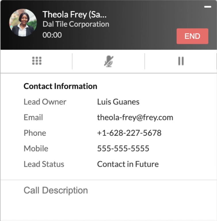 **2.** After clicking on the call icon you will see a popup with the call data and actions to hung up, mute and put the call on hold.