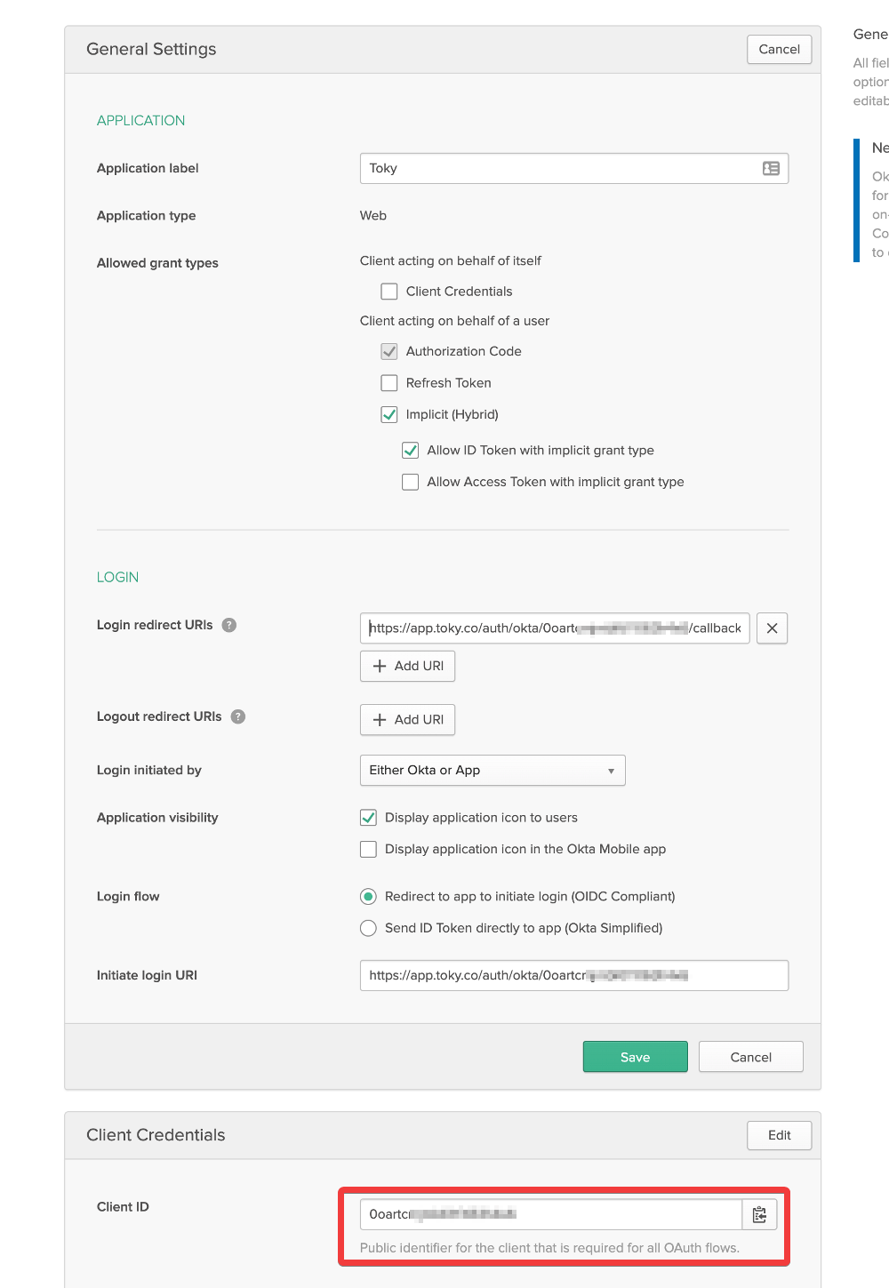 * In the **LOGIN** section, modify the link previously saved in the **Login redirect URIs**, and replace the **clientID** in the link (<https://app.toky.co/auth/okta/>**clientID**/callback), with the value you can find in **Client Credentials** > **Client ID.**