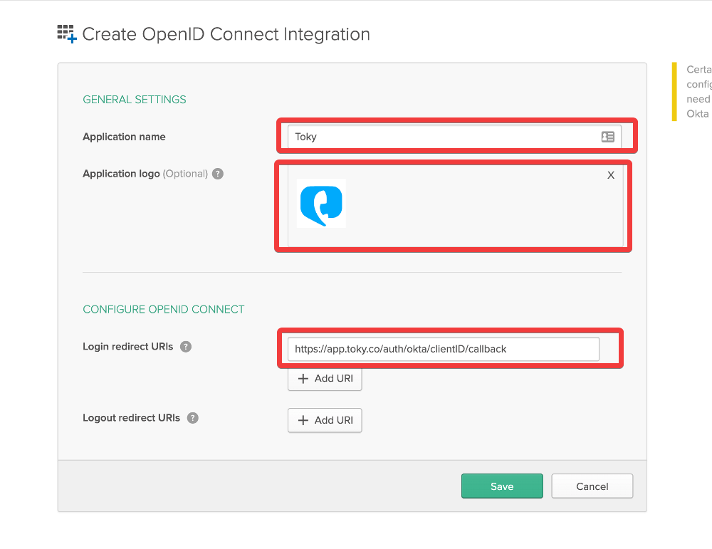 * Type **Toky** as **Application name**, upload the Toky Logo as **Application logo**, and in the section **Configure openID connect**, enter the following URL in the **Login redirect URIs** field: [**https://app.toky.co/auth/okta/clientID/callback**](https://app.toky.co/auth/okta/clientID/callback)