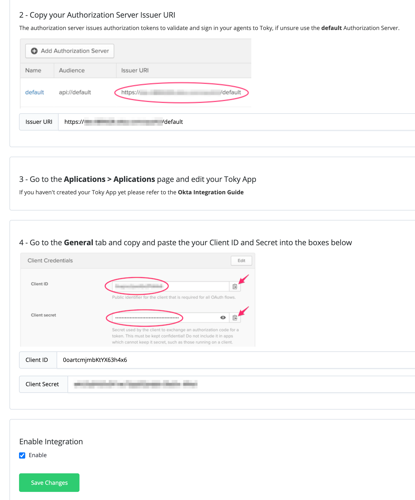 **Important**: These values are used by Toky to start the Authorization Code Flow with Okta from the server-side.